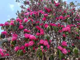このロッジのそばにも大きなシャクナゲの木が満開だったが、いよいよ午後、シャクナゲ街道に突入!このあたりのシャクナゲは見上げるような高木で上の方に花がついている。見上げて写真を撮るのに首が痛くなりそう。下の方には沈丁花の花もけっこう見られた。
